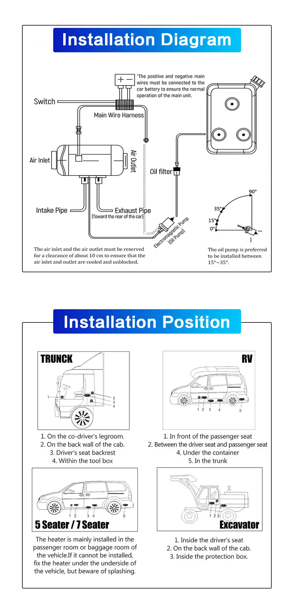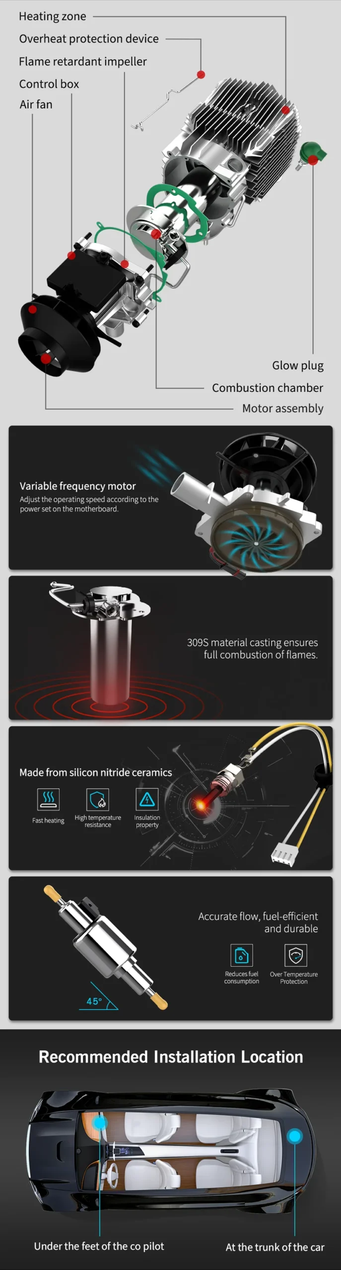 Nauji mobilūs autonominiai dyzeliniai oro šildytuvai 5kw reguliuojamo galingumo maitinasi nuo 24V. Veikia kaip sauso webasto webasta principu, prekiauju treti metai tik kokybiškais gamintojais, užsiimu remontu, išrašau sąskaitas. Tinkamas automobiliams, kemperiams, mikroautobusams ar garažams, sodo nameliams, laivams, ir tt. Bekorpusinius (kur viskas atskirai nesumontuota į dėžę) dažnai montuoja į automobilius mikroautobusus fūras, garažus ir kitas vietas kur mobilumas nereikalingas, Su korpusu (kur viskas sumontuota į dėžę) gali būti nešiojami, keičiama lokacija, tinka žvejybai arba tiems, kas nenori užsiimti montavimu ir nori gražesnio vaizdo tad tinka į kemperius, sodo namelius konteinerius. Turi temperatūros daviklius tad gali veikti temperatūros kontrolės rėžimu ar pagal nustatytą laiką. Ganėtinai tylūs, nereiklūs kurui, lengvai perprantami ir tvarkomi. Turiu visas instrukcijas video paaiškinimus kaip kur kas.